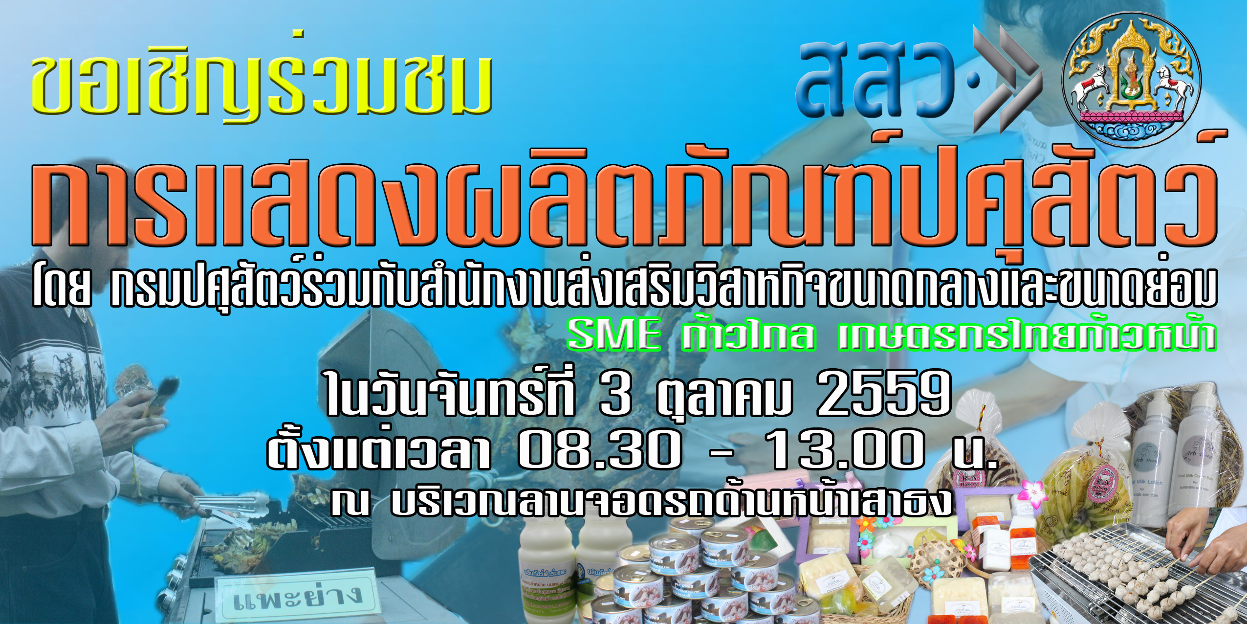 วันพุธที่ 17 ตุลาคม 2559 ศูนย์วิจัยและพัฒนาการปศุสัตว์ที่ 4 นำโดย นายชัชวาล ประเสริฐ ผู้อำนวยการศูนย์วิจัยและพัฒนาการปศุสัตว์ที่ 4 ร่วมกับ บริษัท ประชารัฐรักสามัคคีมหาสารคาม (วิสาหกิจเพื่อสังคม) จำกัด จัดนิทรรศการให้ความรู้และนำสินค้าและผลิตภัณฑ์ไก่งวง ในงาน "ตลาดข้าวประชารัฐ"