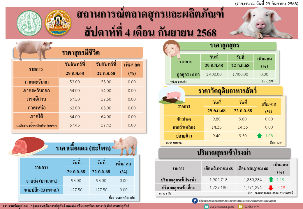 สถานการณ์ตลาดสุกรและผลิตภัณฑ์ สัปดาห์ที่ 4 เดือนกันยายน 2568
